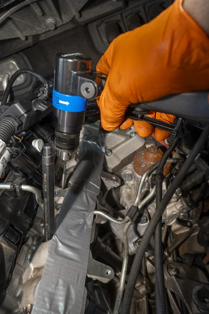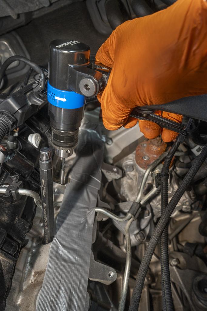 Air angle drill with 120° adjustable drill head. This innovative handle system allows use even in working positions that are very difficult to access. Precise, pre-settable speed regulation via 3-stage rotary wheel on the handle. The stepless trigger enables further fine adjustment of the speed.