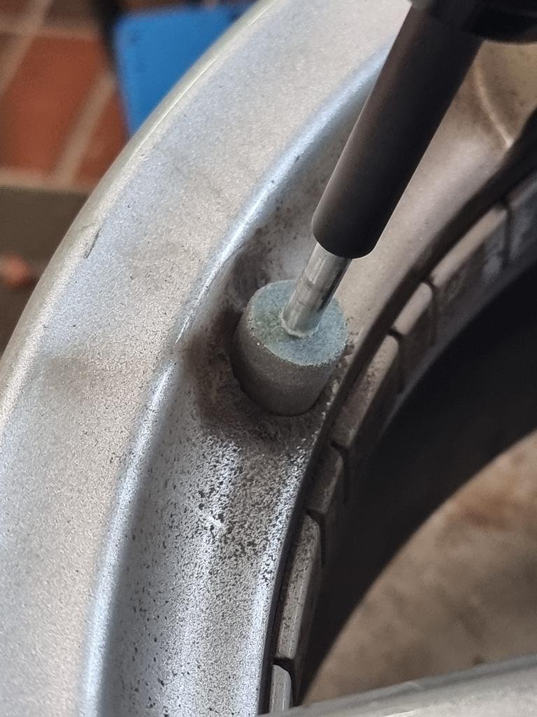 This damage causes air to leak around the tyre valve because the valve is no longer completely flat against the surface. Depending on the severity of the damage, the seat must first be cleaned and/or deburred before the grinding and polishing pins can grind the seat flat in the next work step.