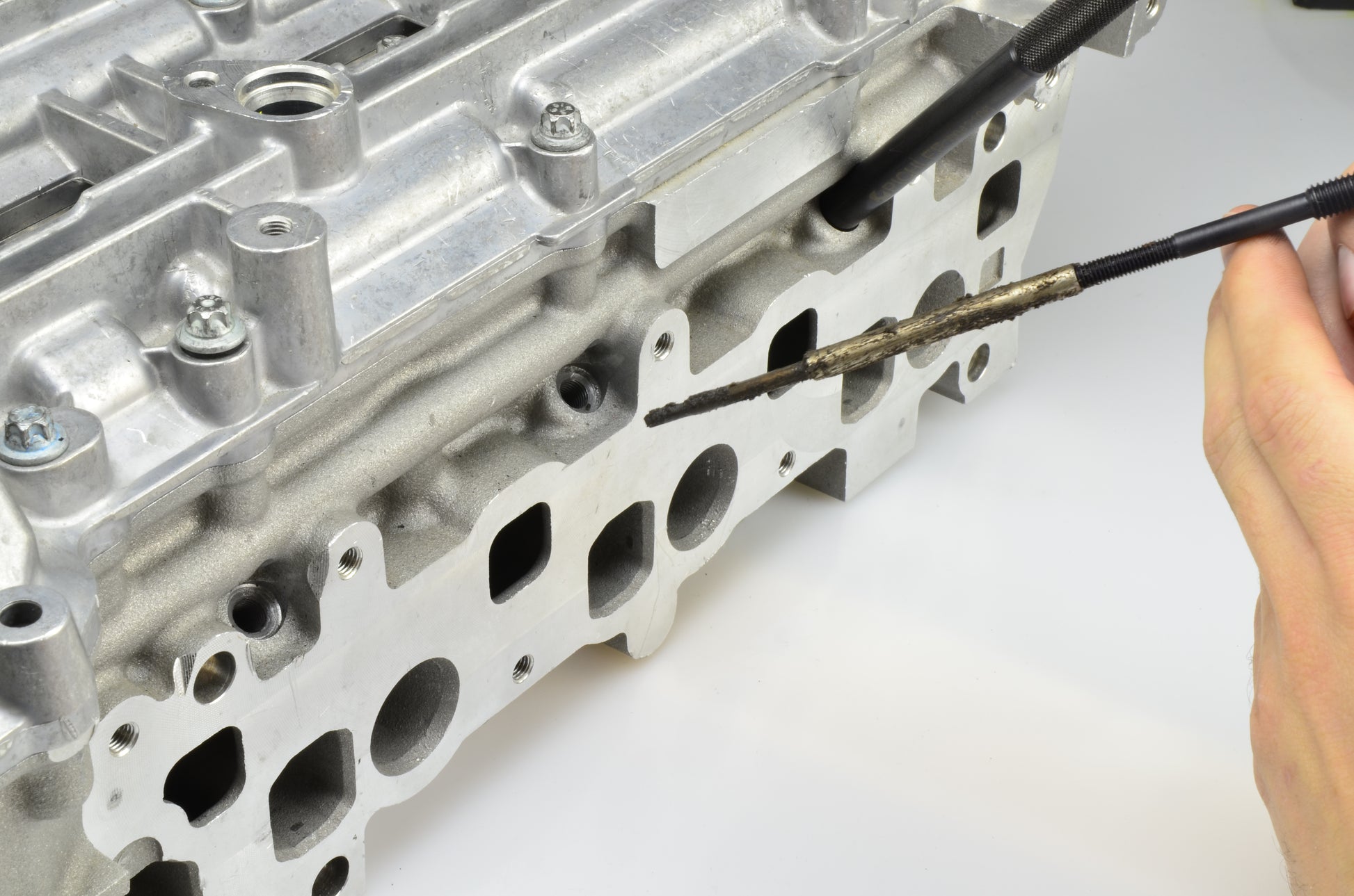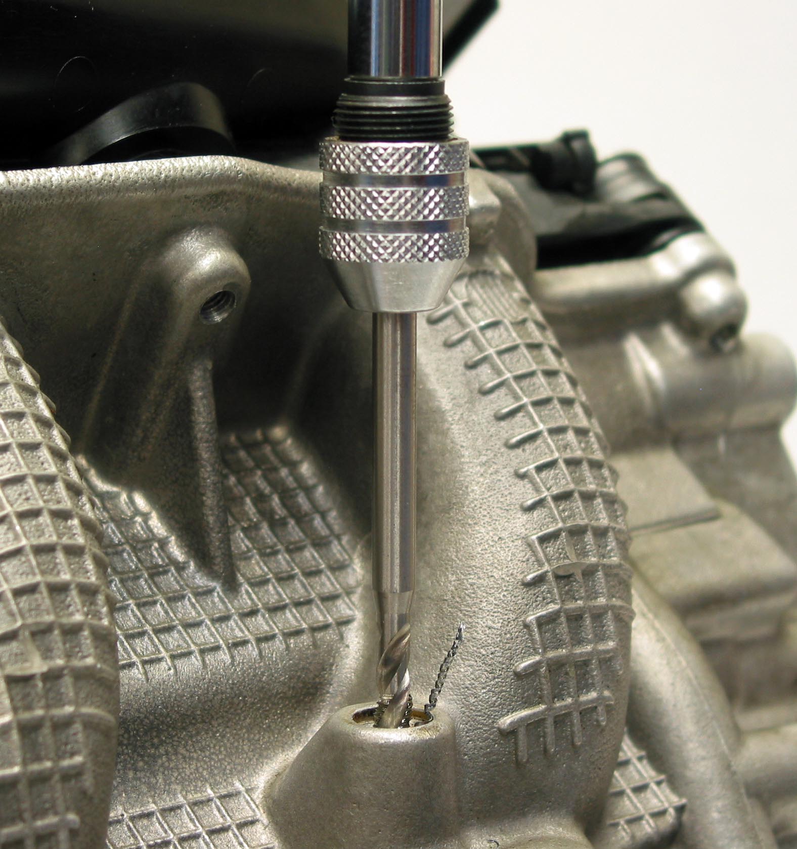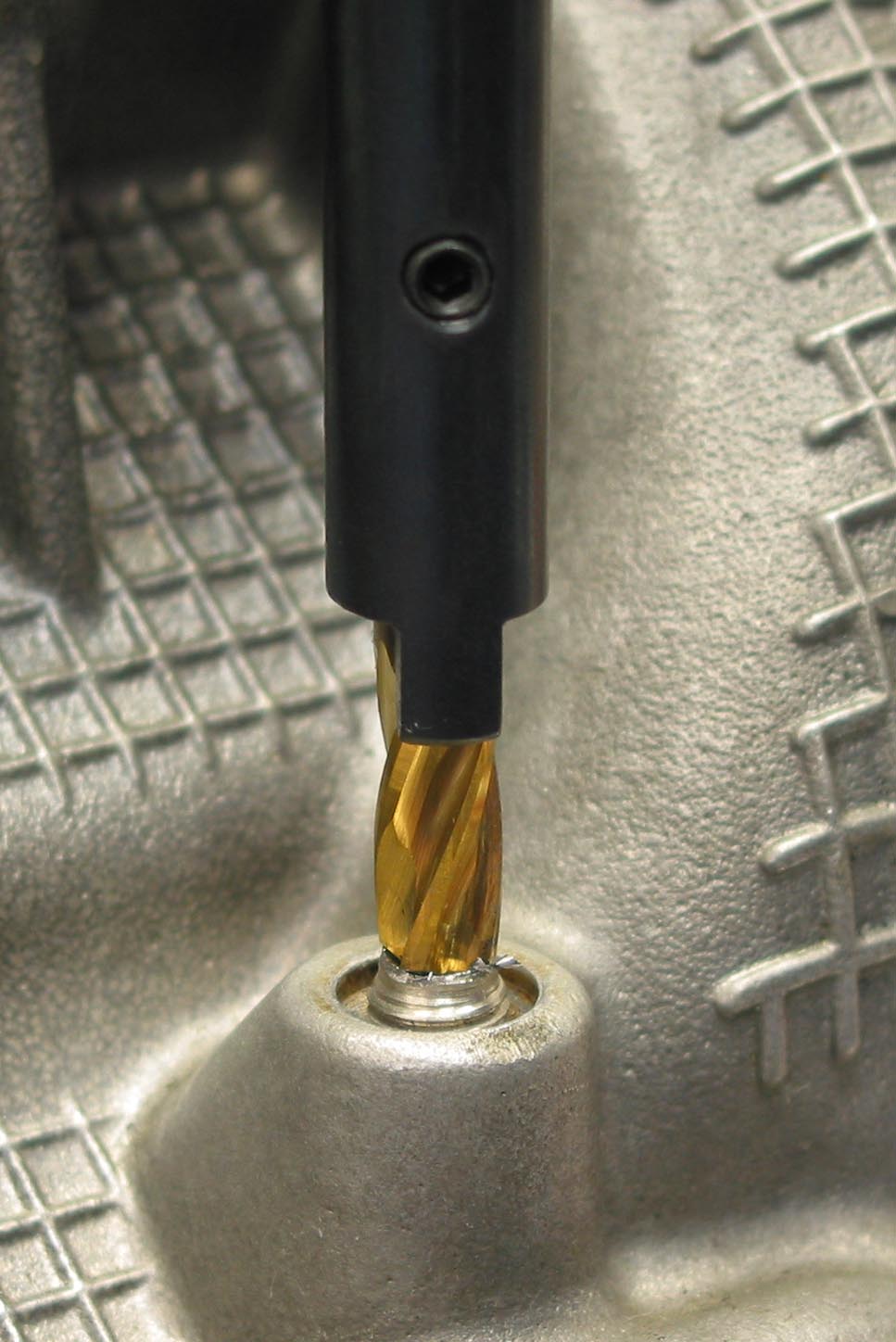 The solution: With this tool, the center contact is removed in just a few steps, a screw-on or impact centering is applied and the glow plugs mounting thread is drilled out in the core diameter. The thread in the cylinder head is not damaged. A pull thread is then cut in the remaining body of the glow element and pulled out of the glow plug shaft with the aid of a spindle. In a final ope-ration, the fastening thread and the bore in the cylinder head are cleaned. If necessary, the sealing seat of the glow plug can be reworked with our special reamer.
