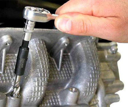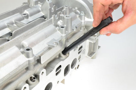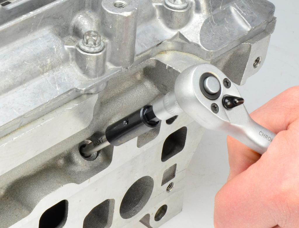In the case of slight damage, the fastening thread in the cylinder head can be recut with the thread regroover. The guide pin on the thread regroover ensures that the regroover is perfectly guided during the taping.